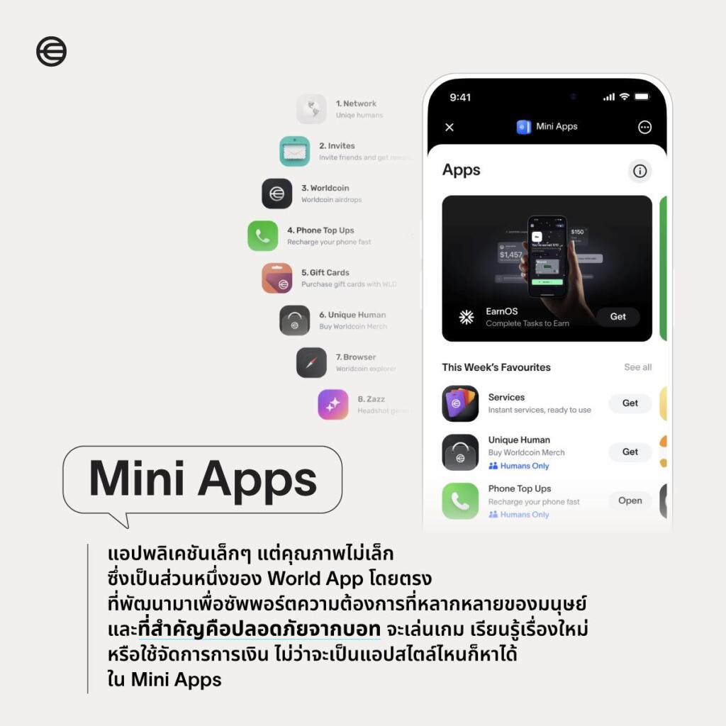 นอกจากฟีเจอร์ที่กล่าวไปก่อนหน้านี้ World App ยังมีระบบ Mini Apps ที่เป็นฟีเจอร์ย่อยของแอปที่น่าสนใจอยู่ภายใน ช่วยให้ผู้ใช้งานสามารถเข้าถึงบริการเสริมต่าง ๆ ภายในแอปได้ โดยไม่ต้องออกจากแอปหลัก ตั้งแต่บริการต่าง ๆ บนโลกดิจิทัล เช่น ซื้อขายสินค้า NFT จ่ายบิล ร่วมกิจกรรมต่าง ๆ เพื่อแลกเปลี่ยนเป็นรางวัล ไปจนถึงเล่นเกม ไม่ใช่แค่แอปกระเป๋าเงินดิจิทัล แต่เป็นแอปที่สามารถต่อยอดไปได้เรื่อย ๆ ในอนาคต